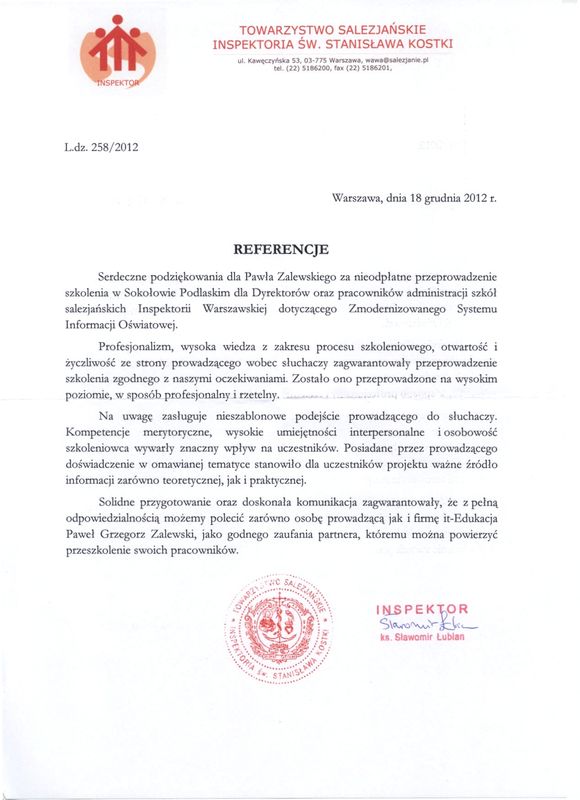 zrealizowane dla Towarzystwa Selezjańskiego Instektoria